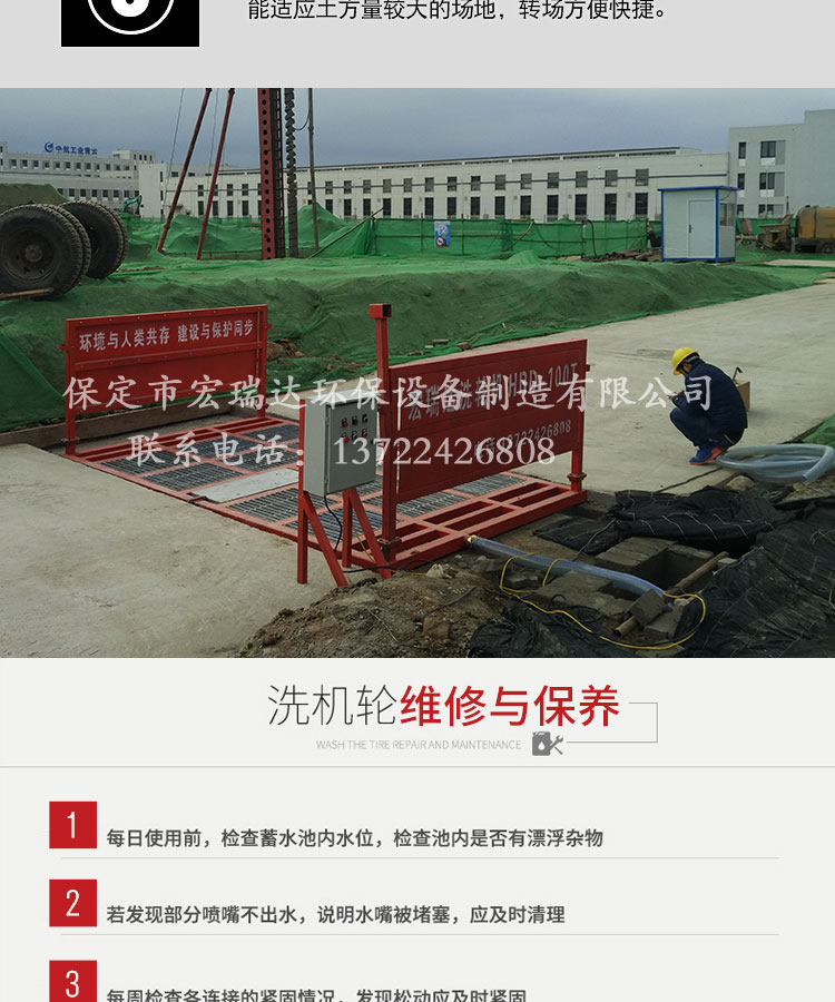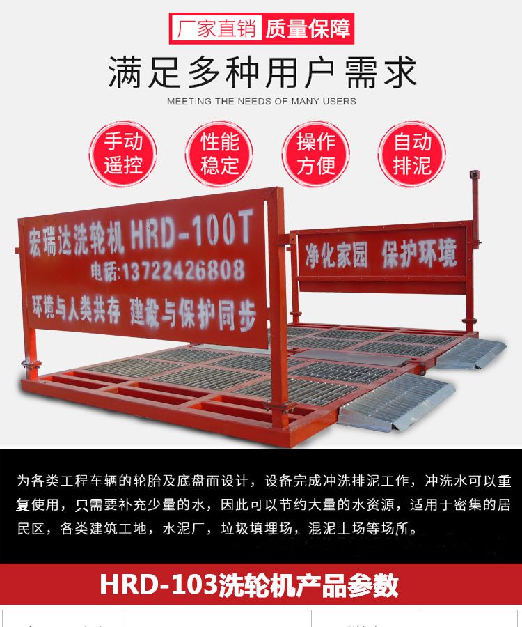 - HRD-103工程車(chē)洗輪機(jī)可自動(dòng)完成沖洗、排泥的工作,沖洗用水可重復(fù)使用,100T以下各類(lèi)工程車(chē)和垃圾運(yùn)輸車(chē)都可以承載,有自動(dòng)、遙控和手動(dòng)三種控制,特別適用于各類(lèi)建筑工地、礦業(yè)工場(chǎng)、水泥制品廠(chǎng)、煤礦、發(fā)電廠(chǎng)、垃圾填埋廠(chǎng)、高檔社區(qū)等場(chǎng)所的進(jìn)出車(chē)輛清洗,從而達(dá)到無(wú)粉塵污染的優(yōu)良工程,二期安裝運(yùn)輸方便,可適用各種工地頻繁轉(zhuǎn)場(chǎng)的需要。