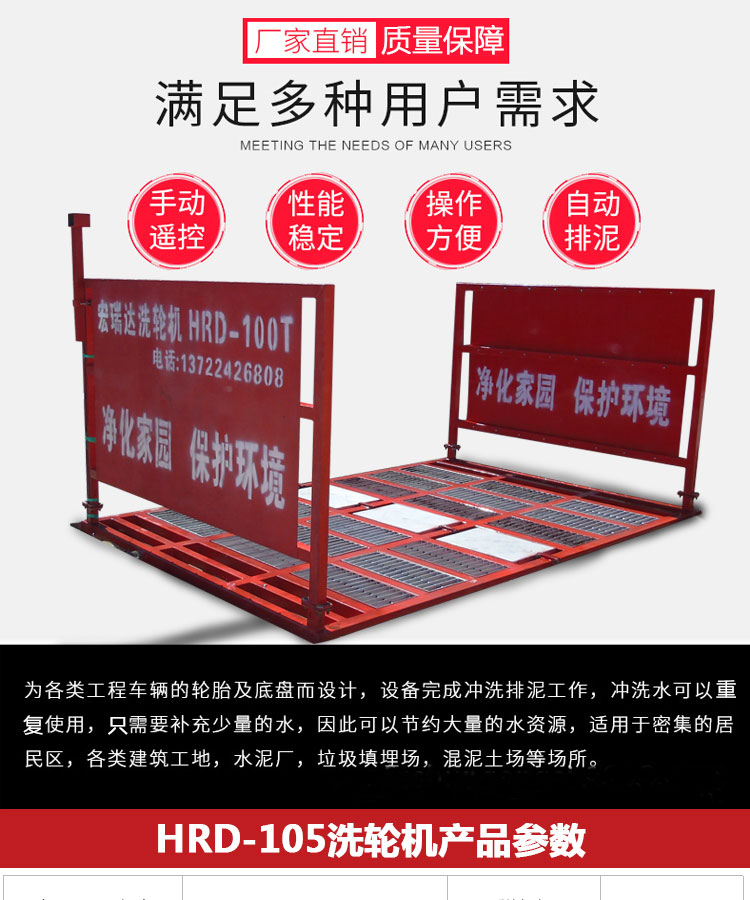 HRD-105工程車洗輪機(jī)可自動完成沖洗、排泥的工作,沖洗用水可重復(fù)使用,100T以下各類工程車和垃圾運輸車都可以承載,有自動、遙控和手動三種控制,特別適用于各類建筑工地、礦業(yè)工場、水泥制品廠、煤礦、發(fā)電廠、垃圾填埋廠、高檔社區(qū)等場所的進(jìn)出車輛清洗,從而達(dá)到無粉塵污染的優(yōu)良工程,二期安裝運輸方便,可適用各種工地頻繁轉(zhuǎn)場的需要。