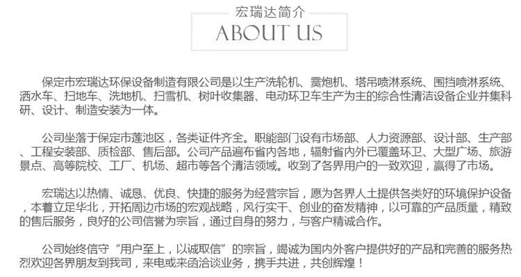 - 高端清洗車(chē),主要用于城市人行道、輔道、路沿石的快速?zèng)_洗和保潔,以及城市小廣告清 理、果皮箱和垃圾桶沖洗、地面污垢去除、地磚還原本色、公交站牌沖刷、公共廁所沖洗等。 對(duì)人行道和輔道進(jìn)行快速保潔。車(chē)輛體積小巧,重量輕,通過(guò)性強(qiáng),且不會(huì)對(duì)人行道地磚,井 蓋等其他公共設(shè)施造成損壞。采用優(yōu)質(zhì)加重型電動(dòng)四輪車(chē)底盤(pán)操作簡(jiǎn)單,載重性好,通過(guò)性 強(qiáng),普通環(huán)衛(wèi)工人即可操作。